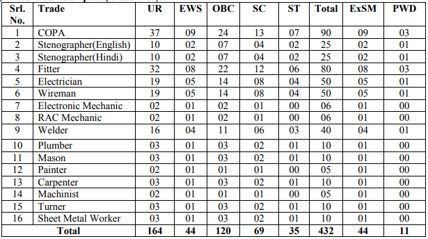 - As per the SECR notification, overall 432 vacancies are allotted for Trade Apprentice posts and trade wise vacancy details are given below