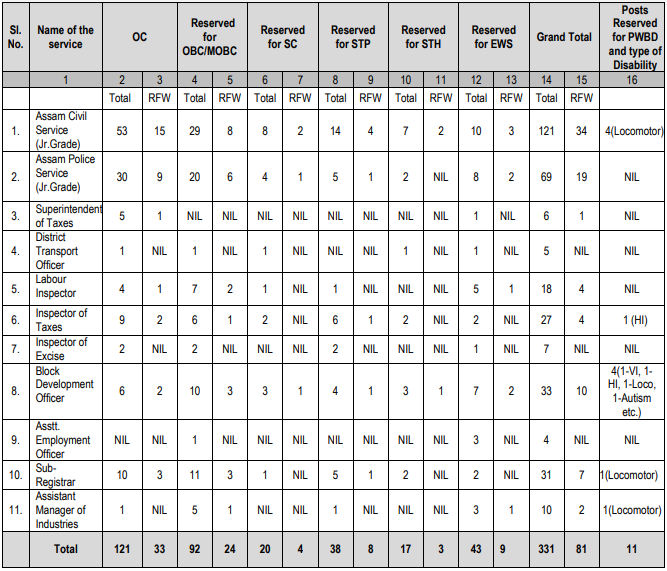 - As per the APSC notification, overall 331 vacancies are allotted for this recruitment. Post wise vacancy details are given below.