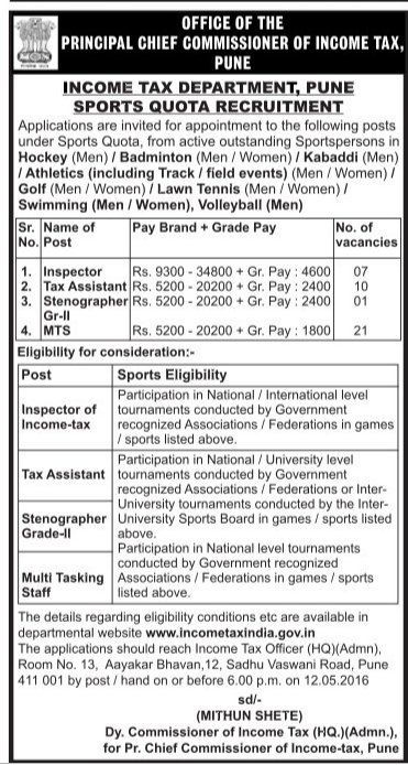 Income Tax Department Recruitment 2016-2017 Has Published Recruitment Job Notification Invited Application Form For 39 Post Of Tax Assistant, Tax Inspector, Stenographer, MTS. All Candidates Are Required To Check Recruitment Details for Income Tax Department Job Advertisements and Apply Offline Before Or As On 12th May 2016. Candidates Are Applying For Income Tax Department Recruitment 2016 Should Be Check Vacancy Recruitment Details Like- Recruitment Qualifications, Exam Pattern, Exam Syllabus, Age Limit Details, Selection Criteria, Selection Process, Application Fees, Pay Scale, Apply Process, Exam Results, Exam Date, And Other Details Before Applying. This Information Are Given Below (For More Related Jobs Check on